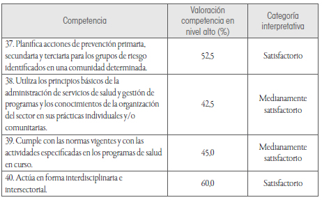 La tabla3 muestra las competencias acompañadas por las frecuencias porcentuales asociadas a las categorías interpretativas de la escala. Se observan, por tanto, las competencias que encontraron un desarrollo óptimo en los estudiantes y aquellas cuyo desarrollo se estimó satisfactorio o medianamente satisfactorio. Es relevante señalar que ninguna de las 38 competencias consideradas en el estudio mostró una categoría interpretetiva correspondiente a un desarrollo deficiente.