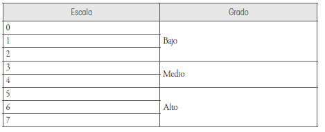 Para el análisis cuantitativo de los resultados obtenidos, se adoptó la metodología de Maldonado Rojas,42 que utiliza una escala de respuestas codificada según el esquema que muestra la tabla 1. La interpretación de los resultados de la investigación se realizó a través del método estadístico descriptivo porcentual. El criterio para analizar los resultados obtenidos se sustenta en las categorías interpretativas diseñadas a partir de la escala de cuartiles y considerando los porcentajes obtenidos solo en el nivel alto, luego de realizada la codificación en base a la escala de respuestas mostrada en la tabla 1. Las categorías interpretativas finales, basadas en los porcentajes obtenidos, se muestran en la tabla 2.