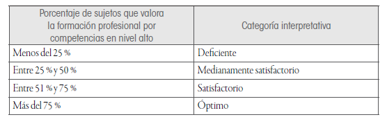 A continuación, se procedió a asignar a cada competencia la categoría interpretativa correspondiente, de acuerdo con el porcentaje logrado en el intervalo superior, a fin de identificar aquellas competencias profesionales según su grado de desarrollo en los estudiantes, es decir, según haya sido deficiente, medianamente satisfactorio, satisfactorio u óptimo, lo que condujo al análisis de la información y a la elaboración de las conclusiones del trabajo.