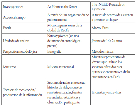 De acuerdo con dicha distinción, en este artículo se revisarán críticamente dos investigaciones que pueden considerarse claves e innovadoras en el campo de los estudios sobre niños y jóvenes sin domicilio,2 uno, llevado a cabo en Francia por Maryse Marpsat, Jean-Marie Firdion y equipo, “The INED research on homeless”; otro, desarrollado en Brasil por Tobías Hetch, “At home in the street”,3 ambos conducidos en la década del 90.