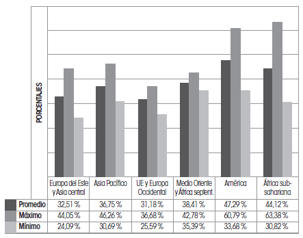 Tomamos a América Latina como caso testigo para dimensionar el impacto de la economía informal. De acuerdo con los estudios de Schneider y Enste34 para la medición de las economías subterráneas, utilizando distintos métodos como insumos físicos o consumo de electricidad, demanda de dinero o el método DYMIMIC, América Latina es la región que presenta el mayor nivel de informalidad en el mundo, aún superior a otros países en vías de desarrollo.35