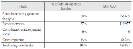 Actualmente, la presión fiscal de Australia es media, con un 27,5 %, entre los treinta y cuatro países miembros. El sistema impositivo australiano está descentralizado, y existen tributos en el ámbito federal, de los Estados, de los territorios y local. Los beneficios empresariales están gravados con un tipo impositivo del 30 % en concepto de impuvesto a las sociedades, y el IVA alcanza el 10 %.