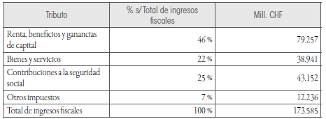 En junio de 1977, se aprobó un artículo constitucional de armonización impositiva, el cual promovía la concordancia tanto a nivel vertical (Confederación, cantones y comunas) como a nivel horizontal (entre cantones, dentro de un cantón determinado, y entre comunas). Con el fin de cumplir con este objetivo, la Confederación sancionó dos leyes en diciembre de 1990: la Ley Federal de Armonización de Impuestos Directos Cantonales y Comunales, que determinó los impuestos que son gravados por los cantones, y define los principios básicos según los cuales las leyes cantonales tienen que ser establecidas; y la Ley sobre Impuestos Federales Directos (Bundesgesetzüberdie direkte Bundessteur, DBG) que grava la renta de las personas. Con relación al impuesto sobre el valor agregado, está en el 8 %, que es el tipo más bajo de Europa. El impuesto a las ganancias representa el 47,5 % de la recaudación de Suiza a nivel federal, seguido por los recursos de la seguridad social, con el 23,3 %.