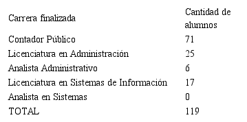 En cuanto al género de los que respondieron, el 61 % fueron hombres y el 39 % restante, mujeres. La distribución respecto de la carrera finalizada en la facultad consta en la tabla 2.1.