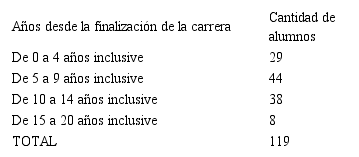 En cuanto al tiempo que ha transcurrido desde la finalización de la carrera hasta la actualidad, este varía desde 0 hasta 20 años, lo cual indica que la muestra es representativa con respecto a esta variable, aunque más de la mitad de las respuestas corresponden a profesionales con menos de 10 años de egresados. La distribución se puede observar en la tabla 2.2.