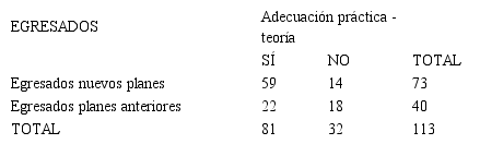 De esta manera, se llegó a la conclusión de que la opinión vertida en cuanto a la falta de adecuación de la formación práctica recibida con la realidad laboral a la cual se enfrentan los egresados es dependiente del plan de estudio cursado.