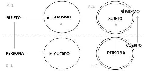 El esquema del cuerpo como contenedor (una cavidad con un límite que marca una región interior y una exterior) emerge de nuestra propia experiencia corpórea en el mundo47 (como ingerir alimentos, excretar, inhalar, exhalar, salir y entrar de habitaciones, manipular objetos) y configura el dominio fuente en esta metáfora. La proyección (como indica el sentido de las flechas) se da desde el dominio más concreto (A) hacia el más abstracto (B). Si estar fuera es pérdida de control, “alcanzarse” configura la fase final, en la cual la persona está contenida dentro del cuerpo y el sujeto, dentro del sí mismo (B.1 y B.2), esto es, una suerte de autofinalización. Representamos un mínimo espacio que deja a estas entidades por fuera para marcar que las entidades no se funden en una y no coinciden exactamente. Más adelante retomaremos la implicancia de estas acciones en el marco de frases más complejas.