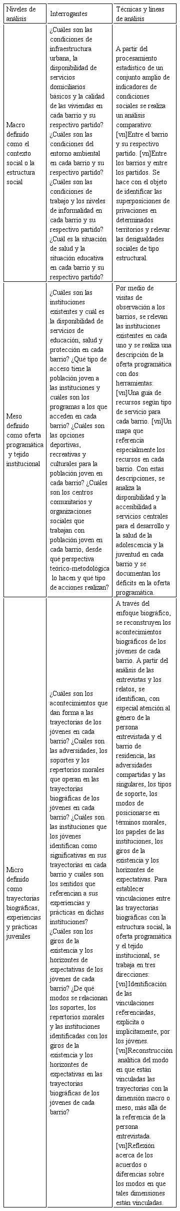 En la siguiente tabla, se presentan los interrogantes y las líneas de análisis según el nivel de análisis, en la cual el plan de trabajo está diseñado como un estudio comparado entre barrios y partidos de una misma área urbana.