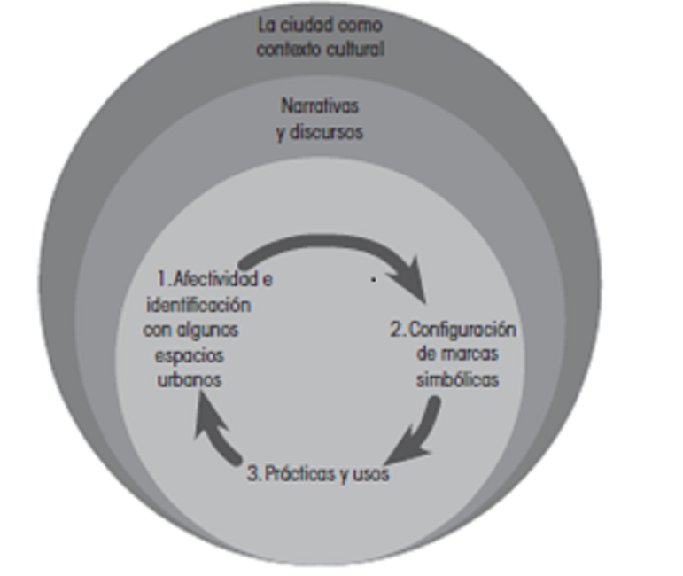 En este ámbito de relaciones, se encuentran los elementos físicos del espacio público urbano, como contraparte de la cultura internalizada. Los imaginarios asociados a este espacio complementan sus expresiones tangibles (que conforman la cultura objetivada) realizándose su apropiación individual y colectiva.