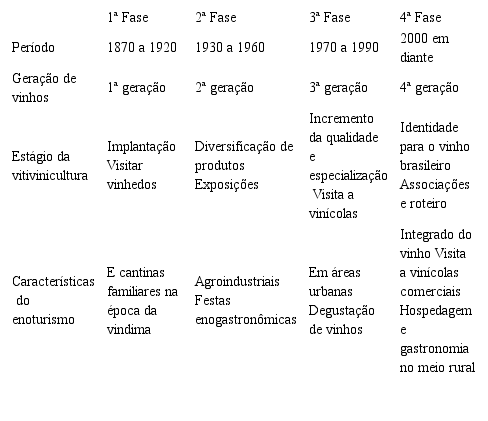 Cabe destacar a classificação proposta por Tonietto (2003) sobre as fases de desenvolvimento da vitivinicultura e do enoturismo na Serra Gaúcha conforme Quadro 1.