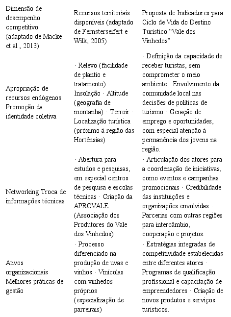Utilizando-se das dimensões apontadas por Macke et al. (2013), vinculamos às mesmas aos recursos territoriais disponíveis do Vale apontados por Fernsterseifert e Wilk (2005). O estudo proposto por Fernsterseifert e Wilk (2005), promoveu uma conversação entre a abordagem conhecida como Visão da Firma Baseada em Recursos (VBR) e o estudo de clusters industriais, visando a análise de seus recursos estratégicos (Quadro 2). Desta vinculação, apontamos indicadores de monitoramento do ciclo de vida para o caso do Vale dos Vinhedos.