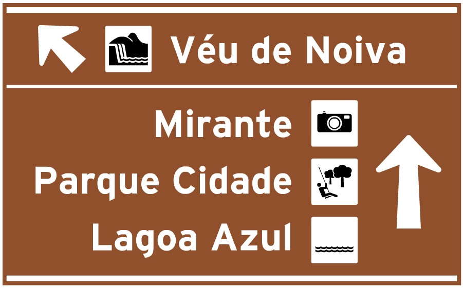 · Padronização: Segue o Padrão utilizado pelo Guia Brasileiro de Sinalização Turística, o qual está de acordo com a resolução de 1996 do CONTRAN, que instituiu o uso da cor marrom para sinalização turística. Utiliza-se a mesma fonte para as letras, o alfabeto série (EM). As setas direcionais assim como os pictogramas também estão em consonância com o previsto no referido guia.