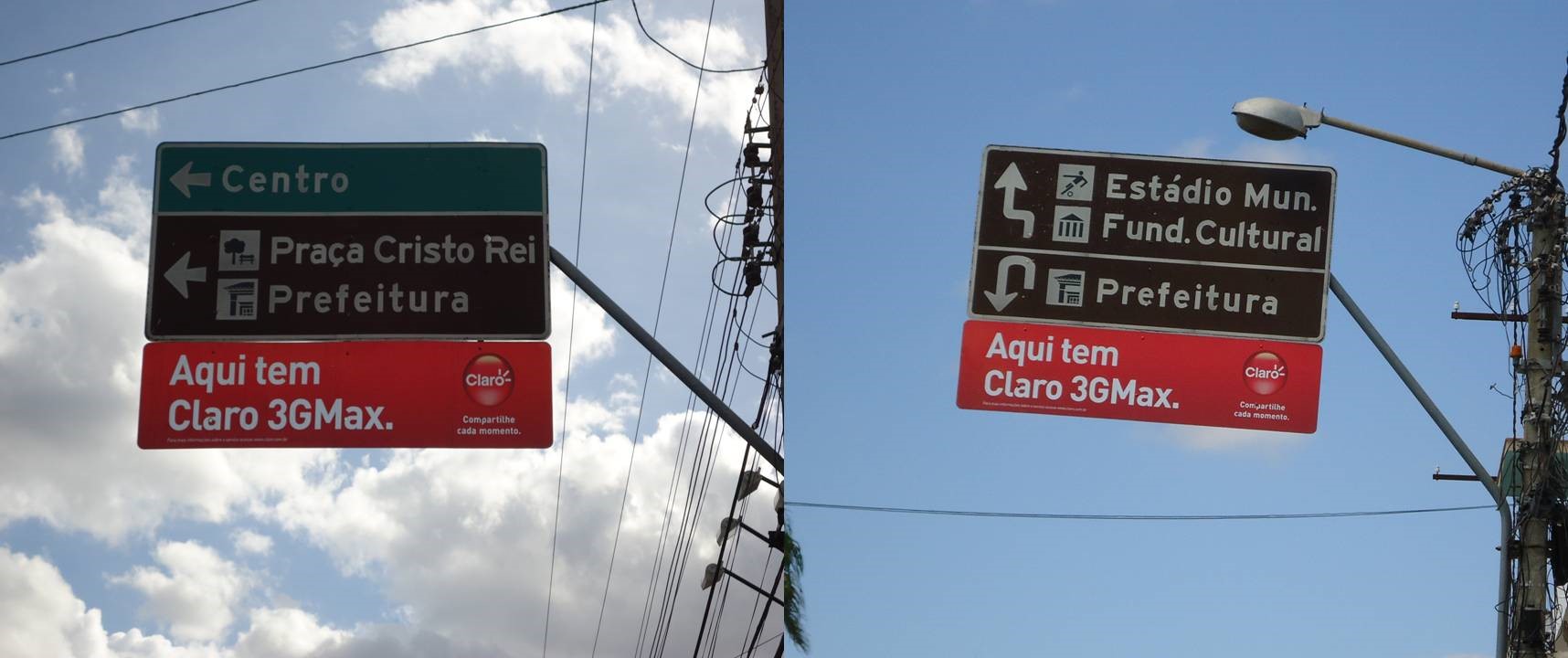 · Visibilidade, legibilidade e segurança: afixadas em lugares altos, não havendo árvores ou outro obstáculo obstruindo a visão do turista, podem ser visualizadas e lidas a uma distância segura, tanto para turistas a pé quanto para motorizados.