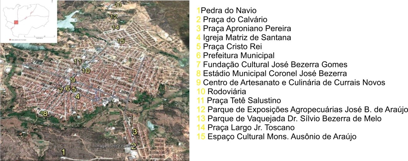 Na inexistência de estudos a respeito da hierarquização dos atrativos turísticos, foram elencados, de maneira empírica, pontos da área urbana no município mais citados em sites, livros e artigos, o que não esgota a possibilidade de que outras áreas não possam ser citados em futuros projetos de sinalização para Currais Novos.