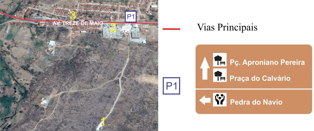 Na figura 8, a placa está localizada a margem direita da Avenida 13 de Maio, no sentido centro, sendo indicados três atrativos, a Pedra do Navio, que embora se situe fora da área urbana, por estar muito próxima a ela e pelo seu apelo turístico é indicada na sinalização, e as praças do Calvário e Aproniano Pereira.