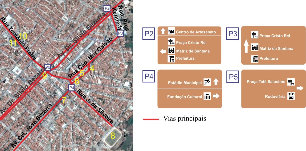 Na análise da figura 9, quatro placas direcionam para oito pontos de interesse. A placa nº 2 (P2), localizada no início da Avenida Dr. Sílvio Bezerra, orienta o turista tanto a seguir em frente, caso queira visitar o Centro de Artesanato e Culinária de Currais Novos, ou a esquerda, caso prefira visitar a Praça Cristo Rei, a Matriz de Santana e/ou a Prefeitura. A placa nº 3, na Rua Cap. Mor Galvão, é um complemento da nº 2 aos três últimos atrativos citados. Situada na esquina entre a Avenida Cel. José Bezerra e a Rua Juventino da Silveira, a placa nº 4 indica a localização da Fundação Cultural José Bezerra Gomes e do Estádio Municipal Coronel José Bezerra. Já a placa nº 5 está disposta entre a Avenida Dr. Sílvio Bezerra e a Rua Teotônio Freire, indicando a localização da Rodoviária e da Praça Tetê Salustino.