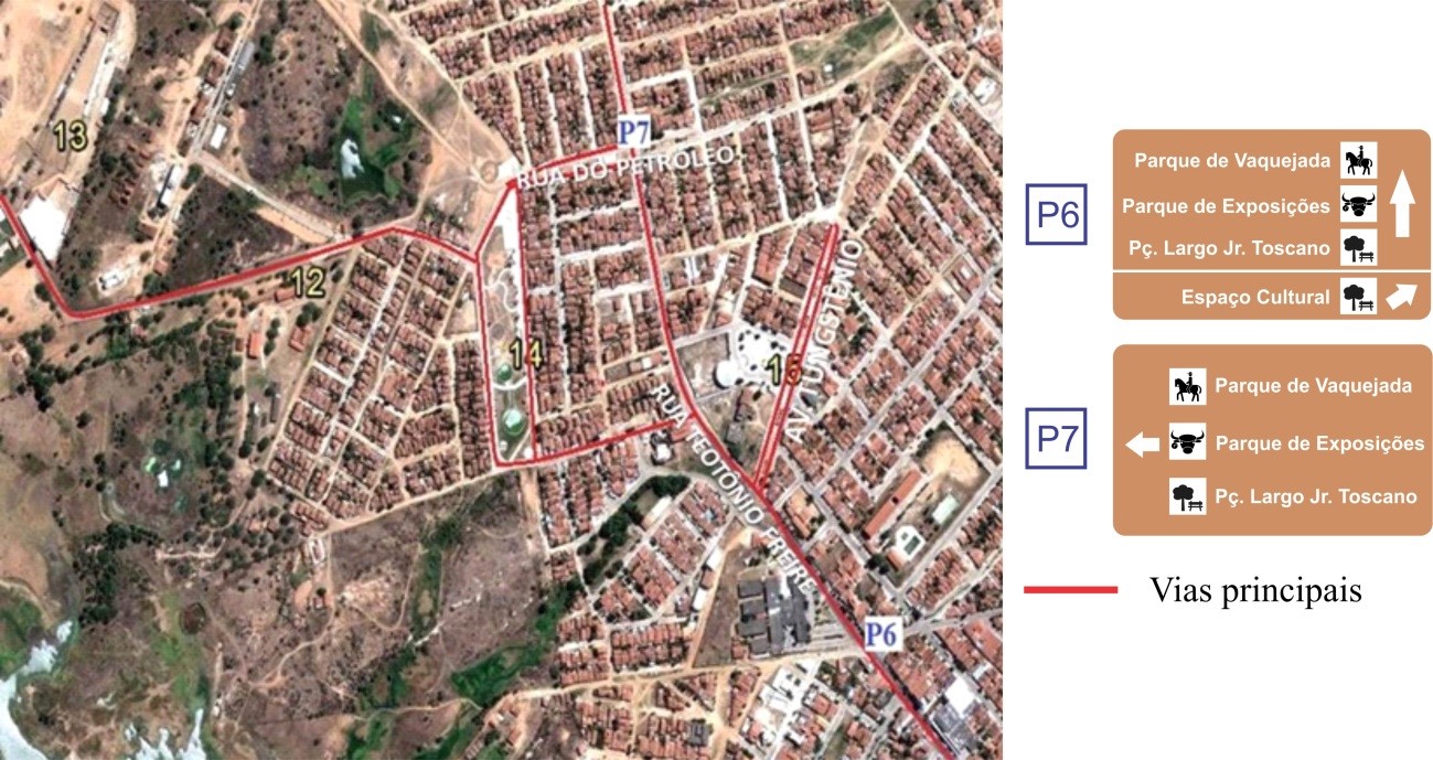 Na figura 10, quatro pontos de interesse são indicados por duas placas. A placa nº 6, entre as ruas Teotônio Freire e Stuessel Augusto indica o Espaço Cultural Mons. Ausônio de Araújo, a Praça Largo Júnior Toscano, o Parque de Exposições Agropecuárias José Bezerra de Araújo e o Parque de Vaquejada Dr. Sílvio Bezerra de Melo. A placa nº 7, situada no encontro das Ruas Teotônio Freire e Rua do Petróleo aponta para os três últimos atrativos citados.