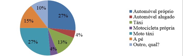 Um fato relevante identificado na coleta de dados diz respeito a que meio de transporte que o turista utiliza para se locomover pela cidade de Currais Novos. Conforme indicado no Gráfico 1, a maioria dos turistas fazem uso de algum tipo de veículo para transporte, sendo o automóvel próprio o mais utilizado, seguido do serviço de moto táxi. Ainda existe uma parcela considerável de turistas que se locomove a pé pela cidade.