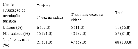 Entretanto, torna-se importante ressaltar que, conforme a tabela 2, a utilização da sinalização é maior entre os turistas que realizam a primeira visita à Currais Novos quando comparado com os que já estão em sua segunda ou mais visitas, onde a necessidade desse tipo de orientação é mais dispensável. Quanto a estes, a maioria diz ter feito uso de outro tipo de orientação como um complemento à sinalização para se locomover pela cidade, como por exemplo, parou para perguntar, seguiu a dica de um amigo, já conhecia o lugar, entre outros.