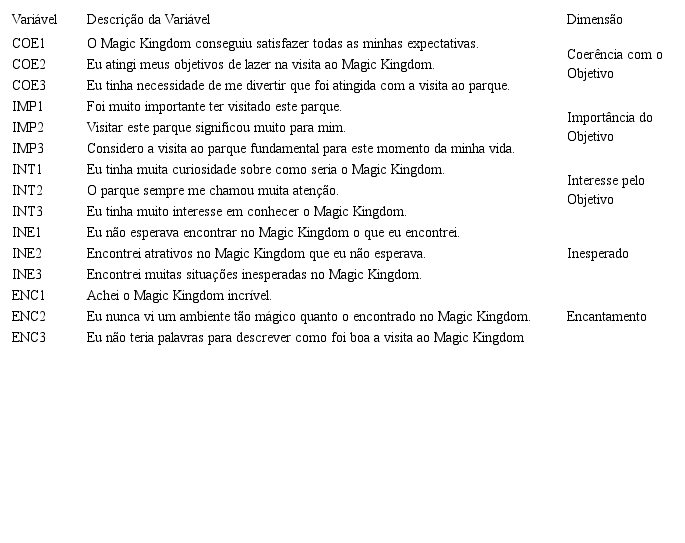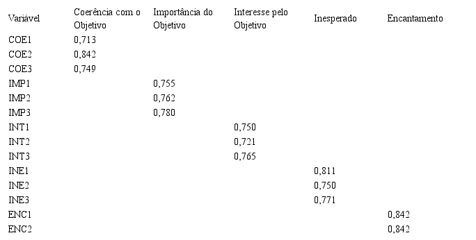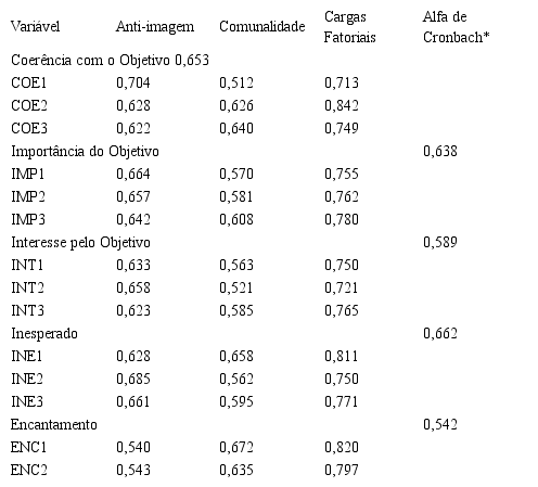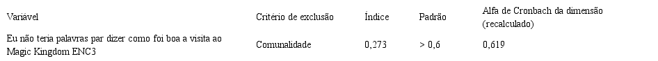 Observa-se que todos os constructos apresentam um valor de Alfa de Cronbach próximo ao valor mínimo estabelecido como critério de aceitação, ou seja, valor de Alfa de 0,6 em estudos de Ciências Sociais Aplicadas, (Hair Jr. et al., 2009). Os índices de Anti-imagem, Comunalidade e Cargas Fatoriais apresentam valores próximos aos critérios estabelecidos para análise, nas variáveis observáveis de todos os construtos, com exceção da variável ENC3 (Eu não teria palavras para descrever como foi boa a visita ao Magic Kingdom) no que se refere ao índice “Comunalidade” que, na avaliação de pressupostos, mostrou-se abaixo do critério utilizado, já que neste índice, os valores de referência devem ser iguais ou maiores que 0,6. Destaca-se que se optou por utilizar aquelas variáveis que apresentaram comunalidades abaixo de 0,6, mas muito próximas deste valor.