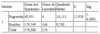 Na tabela 5 é apresentada a análise de variância [NOVA], obtida quando da ocorrência do teste de regressão linear múltipla.