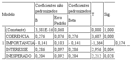 Pelos dados apresentados, observa-se que existem correlações significativas entre as variáveis independentes utilizadas no estudo (Coerência com o Objetivo, Importância do Objetivo, Interesse pelo Objetivo e Inesperado) e a variável dependente “Encantamento”, visto que o nível de significância (p) foi inferior à 0,0001. Desta forma, é possível estimar-se agora os coeficientes de regressão a partir da análise de regressão múltipla, cujos resultados são apresentados na tabela 6: