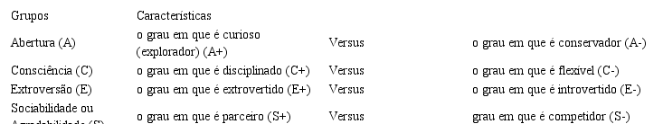 Conforme a Tabela 1, o instrumento TIPI mensura os cinco grupos de personalidade com duas características para cada grupo, sendo uma positiva (+) e uma negativa (-). De acordo com Gosling et al. (2003):