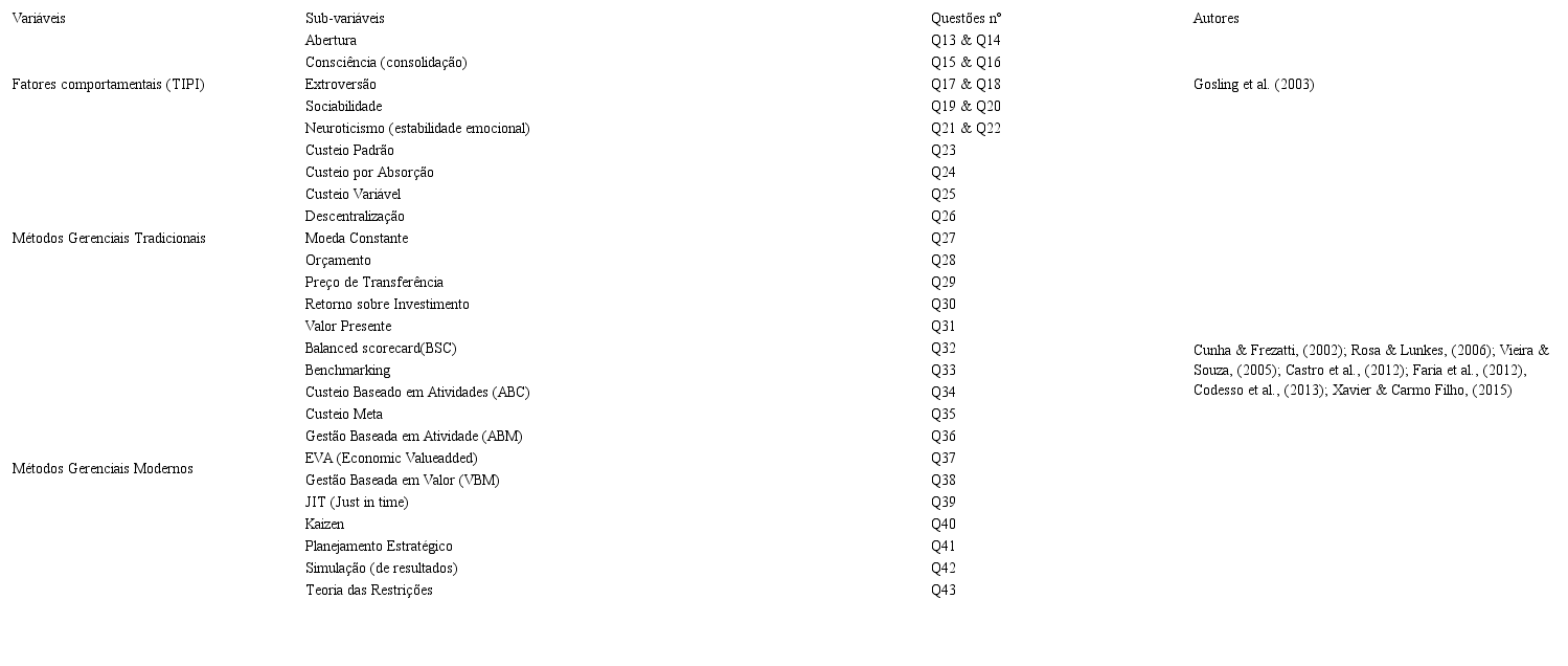 Na Tabela 2, são apresentadas as variáveis que representam os fatores comportamentais do gestor e os métodos gerenciais que foram evidenciados, de acordo com a revisão de literatura realizada sobre a temática.
