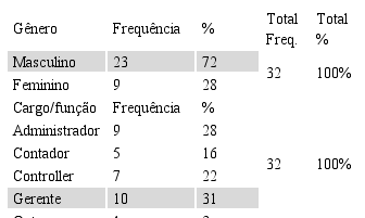 O perfil dos respondentes da amostra apresenta alguns aspectos importantes para a análise de dados. Assim, a Tabela 3 apresenta as principais características evidenciadas na amostra pesquisada, contemplando o gênero e o cargo ou função desempenhada atualmente pelos responsáveis pela gestão dos hotéis de Santa Catarina participantes da pesquisa.