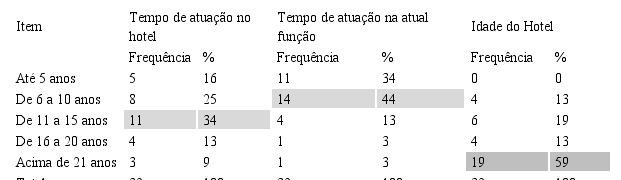 Entretanto, ainda foram observadas na amostra pesquisada aspectos relacionados ao tempo de trabalho do gestor no hotel, na função e a idade da organização hoteleira, sob o qual os dados estão apresentados na Tabela 4.