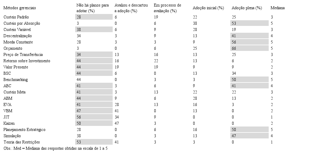 Os métodos que ficaram com uma mediana 3, entre a adoção plena, parcial, ou sem planos de adoção correspondeu ao Balanced Scorecard [BSC] com 44% dos respondentes da pesquisa sem planos de adoção e outros 34% já com adoção plena deste artefato. O Custeio Meta com 41% dos hotéis sem planos de adoção, o Custeio Variável com 38% dos hotéis sem planos de adoção, o Preço de Transferência com 34% da amostra investigada sem planos de adoção e o Custeio Padrão com 28% dos hotéis sem planos de adoção e outros 25% com adoção completa deste método de custeio. No estudo de Faria et al. (2012) o BSC apresentou baixa utilização, como também outros métodos considerados modernos.