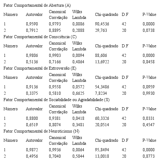 Entretanto, destaca-se que as combinações lineares significativas foram observadas para os respectivos fatores comportamentais: Abertura com significância ao nível de 1%, Consciência ao nível de 1%, Sociabilidade ou Agradabilidade ao nível de 5% e para o fator do Neuroticismo ao nível de 1%. Sendo que não foram obtidas combinações lineares significativas estatisticamente para o fator comportamental referente a Extroversão, conforme pode-se observar nos valores representados pelo P-Value.
