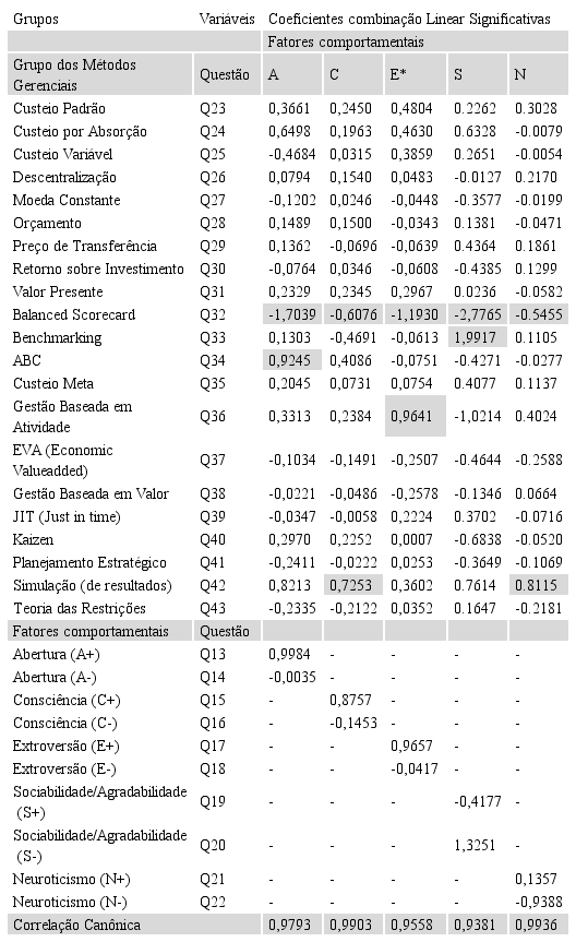 Diante desses achados, a Tabela 7 apresenta o resultado obtido com o cálculo da correlação canônica entre o conjunto de variáveis do grupo dos fatores comportamentais [TIPI] com o conjunto de variáveis do grupo dos métodos gerenciais utilizados no processo de gestão das organizações empresariais.