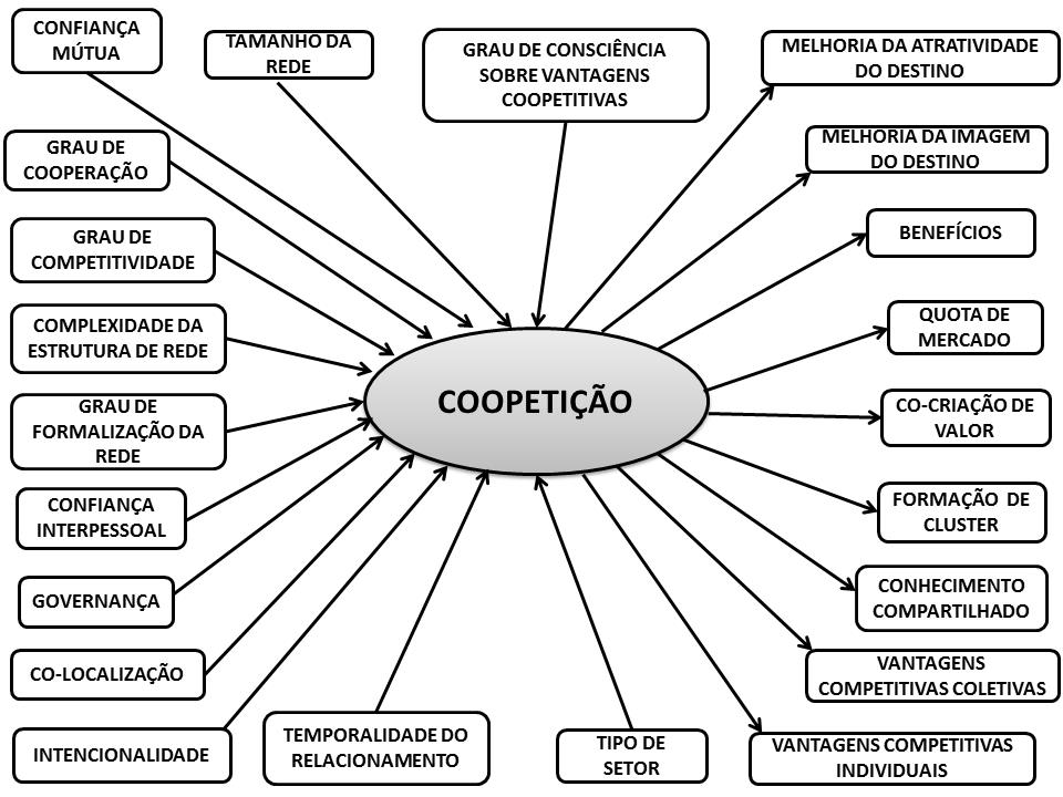 Por outro lado, existem estudos que tratam a coopetição como uma variável que explica o resultado de uma rede, sistema ou do destino turístico. Neste caso os estudos relacionam os resultados de melhoria de atratividade e imagem do destino (ex. em Kylänen & Mariani, 2012), benefícios e melhoria da quota de mercado (ex. em Guo et al., 2014; Tinoco & Sherman, 2014), sucesso na formação e manutenção de cluster turístico (ex. em Aldamiz-Echevarría et al., 2014), geração de conhecimento compartilhado (ex. em Werner, Dickson & Hyde, 2015), co-criação de valor (ex. em Lorgnier & Su, 2014) e vantagens competitivas tanto coletivas como individuais (ex. em Della Corte & Sciarelli, 2012; Van der Zee & Vanneste, 2015).