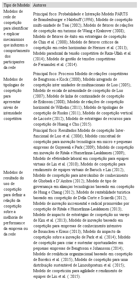 Os estudos apresentam diversos outros construtos que são relacionados à coopetição como resultado ou como fatores indutores deste comportamento e também abordam este comportamento em nível intra e interorganizacional. Della Corte e Aria (2016) consideram que os estudos de coopetição podem ser divididos nos que abordam a intensidade, a tipologia e os impactos. Anteriormente, Bengtsson e Kock (2014) também categorizaram os estudos, considerando que alguns estudam a probabilidade, a interação, o processo ou os resultados da coopetição. O Quadro 1 apresenta alguns exemplos de modelos de coopetição encontrados na literatura deste período, dividindo-os segundo a classificação de estudos definida por Bengtsson e Kock (2014).