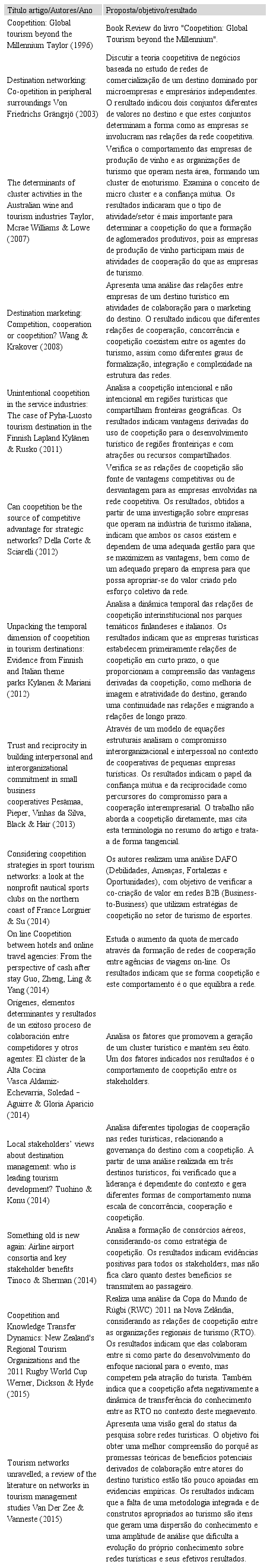 O Quadro 2 sintetiza os 15 estudos que foram identificados nas bases de dados anteriormente citadas que continham a palavra coopetição no título, palavras-chaves ou resumo do artigo e eram aplicações empíricas no turismo.