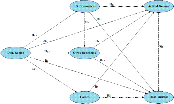 Al combinar todas las hipótesis propuestas en la revisión teórica realizada se obtiene el modelo estructural propuesto en la Figura 2, planteando que el apoyo a la llegada de más turistas depende de un conjunto de efectos directos (Hipótesis 3, 5, 8 y 9) e indirectos (Hipótesis 1, 2, 4, 6 y 7) que proponen los beneficios, los costes y la actitud general como elementos mediadores.
