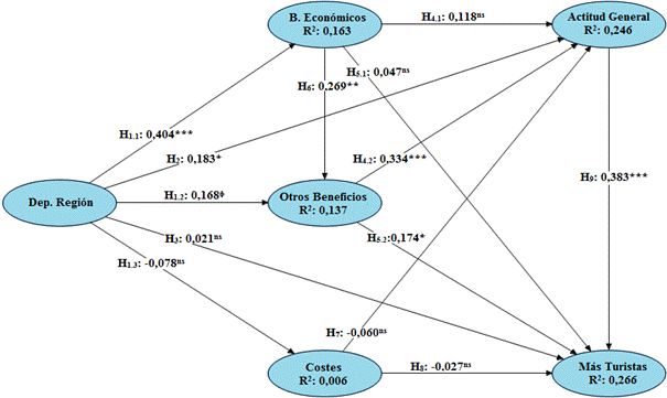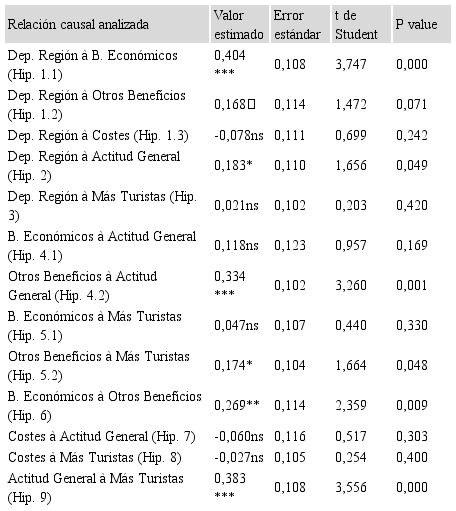 · La percepción de que la región depende del turismo solo afecta a la percepción de los beneficios económicos, a la actitud general de los residentes y, en menor medida, sobre los otros beneficios, no mostrando efectos significativos sobre los costes. Hay que tener en cuenta que los destinos turísticos que han prosperado gracias al turismo son los que muestran mayor dependencia económica del turismo debido a los empleos, empresas e inversiones generados. Por tanto, la relación esperable más fuerte es entre la dependencia económica y los impactos económicos, siendo los otros elementos efectos secundarios del desarrollo turístico.