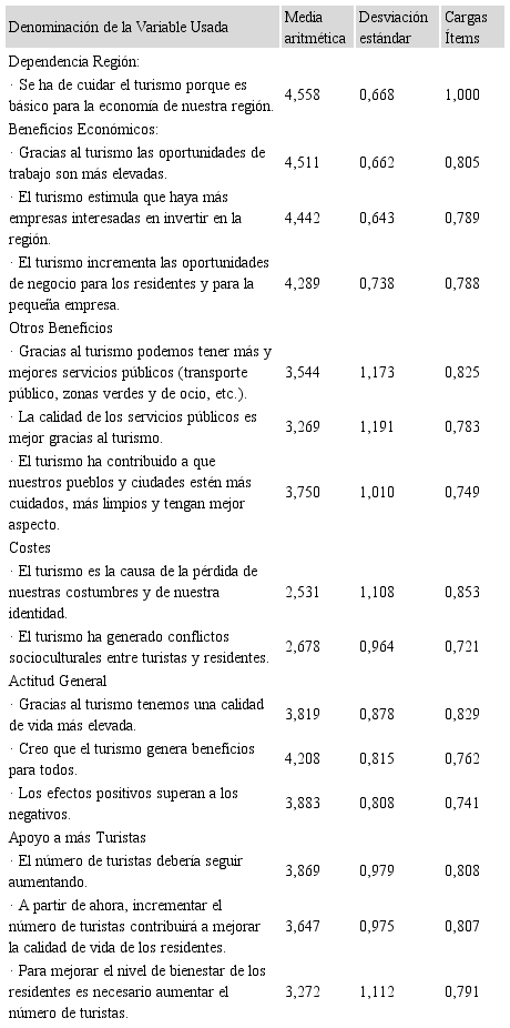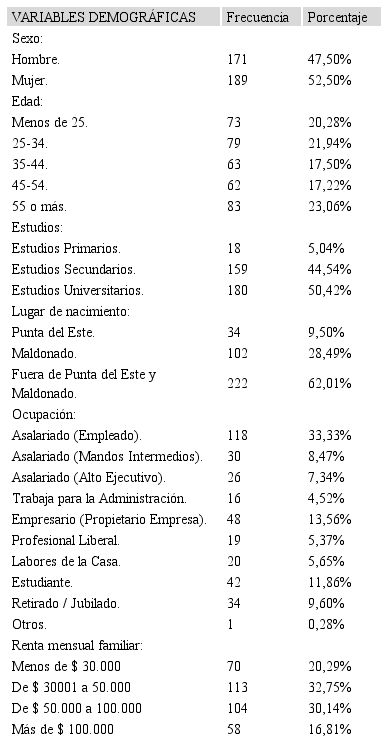 Los datos utilizados corresponden a una encuesta realizada entre junio de 2013 y diciembre de 2014 mediante un procedimiento de muestreo por conveniencia. Si bien no se establecieron cuotas, se controlaron diversos parámetros demográficos con la finalidad de que la muestra fuera lo más parecida posible a la población en su composición demográfica. Durante el proceso de introducción en el programa estadístico, los datos de las encuestas fueron revisados considerando los perfiles demográficos. De detectarse sesgos, se procedía a modificar el procedimiento de distribución de los siguientes cuestionarios buscando corregir estas desviaciones. Los parámetros demográficos de control fueron la edad, el sexo y la ocupación. El trabajo de campo se realizó en la conurbación Maldonado-Punta del Este y se obtuvieron 360 cuestionarios válidos. El cuestionario usado es el mismo que en Ramón (2012), el cual era una adaptación de Gursoy y Rutherford (2004) y Gursoy et al. (2002). Este cuestionario contenía ítems con escalas Likert de cinco puntos como opción de respuesta, siendo 1 “totalmente en desacuerdo”, 3 “indiferente” y 5 “totalmente de acuerdo”, y un conjunto de preguntas sociodemográficas. Los ítems medidos mediante escalas Likert son el elemento principal para analizar las actitudes de los residentes y una parte de estos ítems conforman el modelo de medida del modelo causal propuesto. Sobre los ítems y las variables demográficas se realizó un primer análisis univariante y bivariante mediante el programa estadístico DYANE 4.0 (Santesmases, 2009), generando el perfil demográfico de la muestra (Tabla 1) y los valores medios y desviaciones de los ítems utilizados posteriormente en el análisis causal (Tabla 2). Para el análisis causal se utilizó el software SmartPLS 2.0M3 (Ringle, Wende & Will, 2005), basado en la Regresión de Mínimos Cuadrados Parciales.