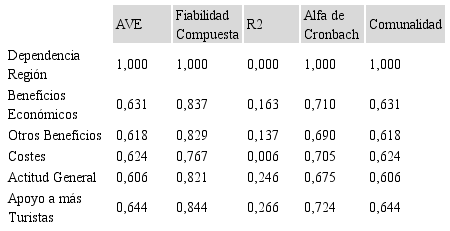 La validez convergente (Anderson & Gerbing, 1988) implica que un conjunto de indicadores representa un único constructo subyacente, pudiendo ser esto demostrado por medio de su unidimensionalidad (Henseler et al., 2009). Se suele valorar por medio de la Varianza Extraída Media (AVE). Los valores mínimos recomendados son 0,5 (Bagozzi & Yi, 1988), lo que quiere decir que más del 50% de la varianza del constructo es debida a sus indicadores. Los constructos utilizados muestran un AVE superior a 0,606 en todos los casos (Tabla 3), superior al mínimo de 0,5 exigido por la literatura, pudiendo afirmarse que existe validez convergente.