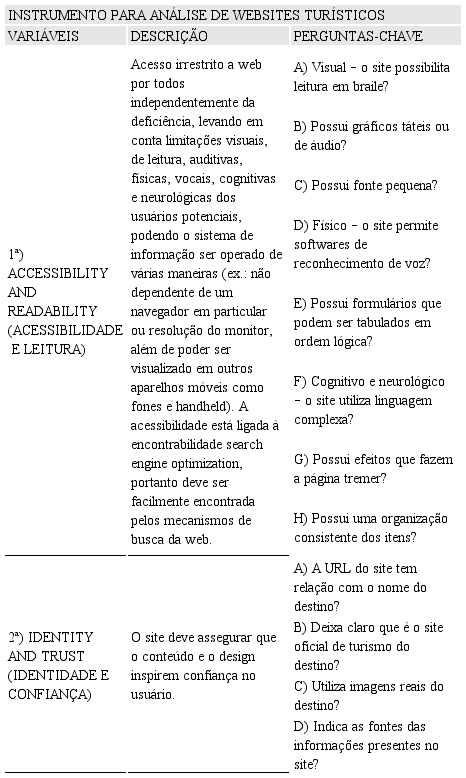 Optou-se pelo uso de um instrumento de análise de websites turísticos que leva em consideração as variáveis definidas pelo estudo feito pela OMT (2005), que definiu um modelo de avaliação dos fatores críticos de sucesso, o “Evaluating and Improving Websites” (Avaliando e Melhorando Websites). Os procedimentos utilizados foram guiados por Ferreira et al. (2010), de forma a ser utilizado um “método de investigação heurística de usabilidade” sem a aplicação de questionário, a ser respondido pelo autor da pesquisa com base em coleta de dados na internet. Portanto, uma vez que a rede será a principal fonte de informações, ainda segundo o autor, “trata-se de um estudo descritivo, com pesquisa telematizada”.