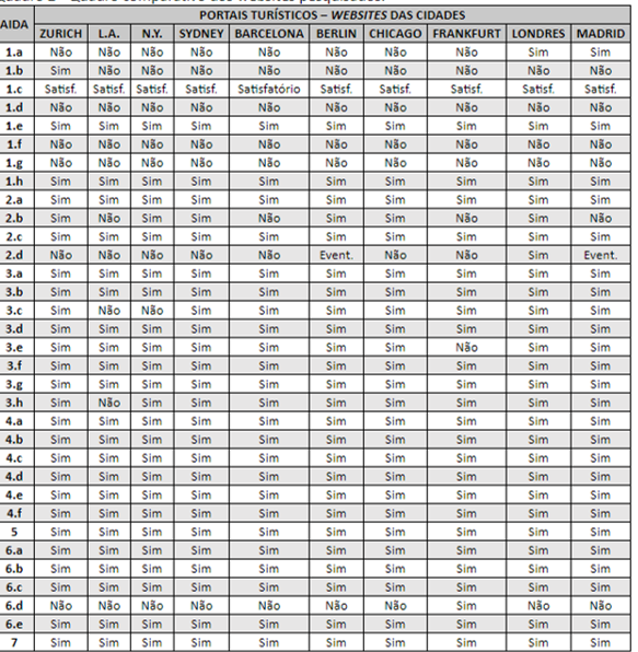 Nesta área da pesquisa, foi elaborado um quadro comparativo contendo as variáveis dos Fatores Críticos de Sucesso proposto pela OMT (2005), as quais têm como base o conceito AIDA (Quadro 01) e todas as respostas compatíveis aos portais de cada destino (Quadro 02).