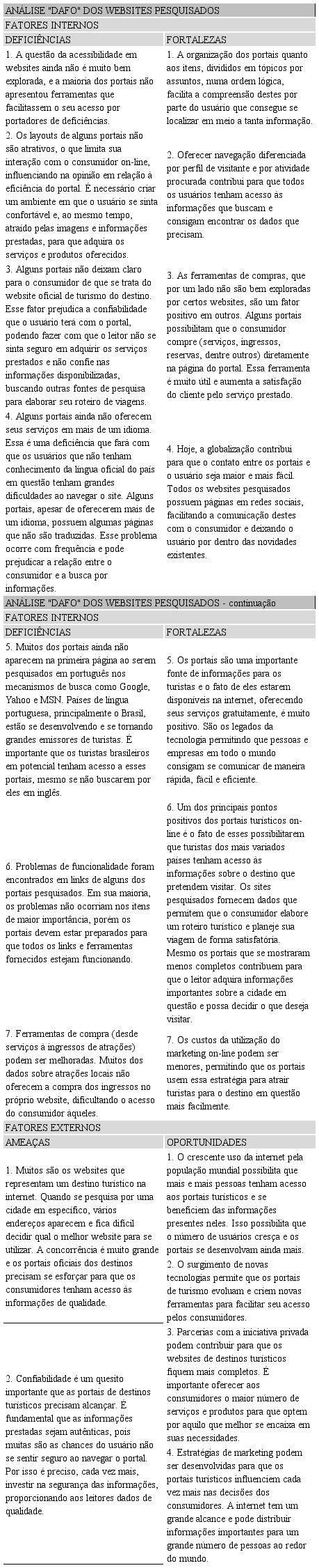 A análise “DAFO” é utilizada na gestão e no planejamento estratégico e visa analisar o cenário em questão. É composta pela avaliação do ambiente interno, do qual fazem parte as deficiências e as fortalezas; e do ambiente externo, que engloba as ameaças e as oportunidades. A seguir, a Tabela 03 apresenta a análise “DAFO” dos portais turísticos analisados por esta pesquisa: