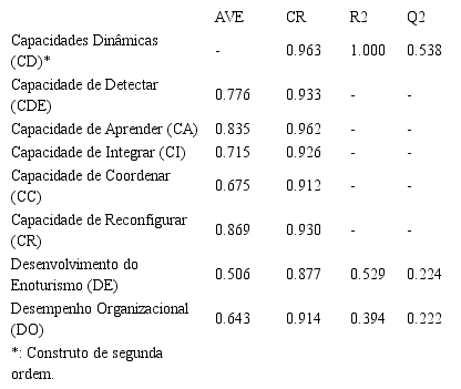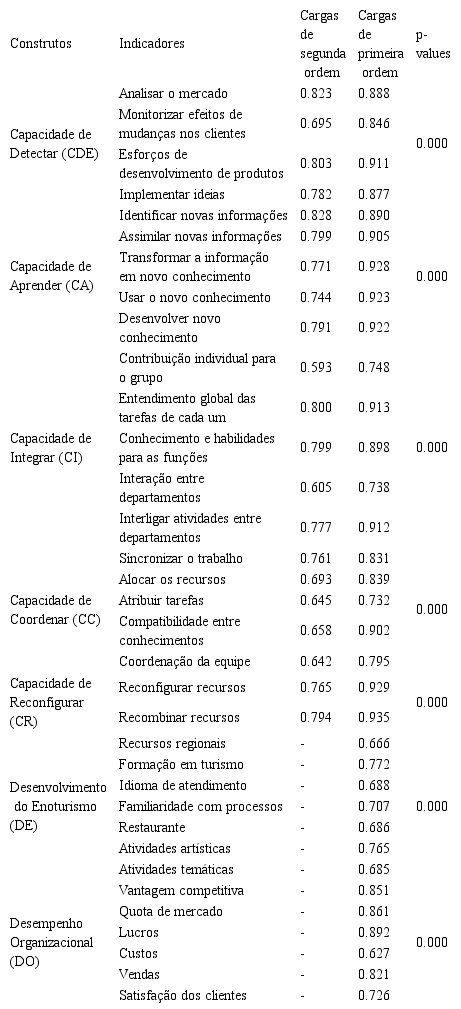 Devido à relação formativa do construto CD com as 5 capacidades, o modelo pode ser classificado como um “construto molar de segunda ordem” (Chin, 2010) ou como um “modelo refletivo-formativo” (Becker, Klein, & Wetzel, 2012), no sentido de que existe um “conceito geral” (que é o construto CD, no modelo da Figura 1), que é mediado pela influência dos construtos refletivos de primeira ordem (CDE, CA, CI, CC e CR), na variável endógena subsequente, desenvolvimento do enoturismo (DE). Assim, esta abordagem permite derivar o efeito indireto dos 5 construtos refletivos de primeira ordem (CDE, CA, CI, CC e CR) no DE como um produto de seus pesos para o construto formativo (CD) e o coeficiente de caminho que liga CD e DE. Além desses construtos, o modelo também propõe que DE e desempenho organizacional (DO) são construtos refletivos de primeira ordem.