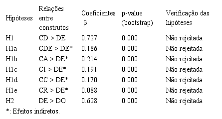 As estimativas do coeficiente de caminho são apresentadas na Tabela 3. Estes são os coeficientes estimados para as relações diretas e indiretas, no que diz respeito a H1 (a, b, c, d, e), e a H2. Estes resultados e os correspondentes valores de p-values são resultados do software SmartPLS. Nenhuma hipótese é rejeitada nesta pesquisa (p <0.05).