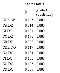 Os efeitos totais das variáveis latentes exógenas sobre o DE e o DO são representados na Tabela 4. Como pode ser visto, a variável capacidade de aprender (CA) tem maior incidência no desenvolvimento do enoturismo (efeito total = 0.214) e no desempenho organizacional (DO) (efeito total = 0.120). Todos os efeitos totais são estatisticamente significativos.