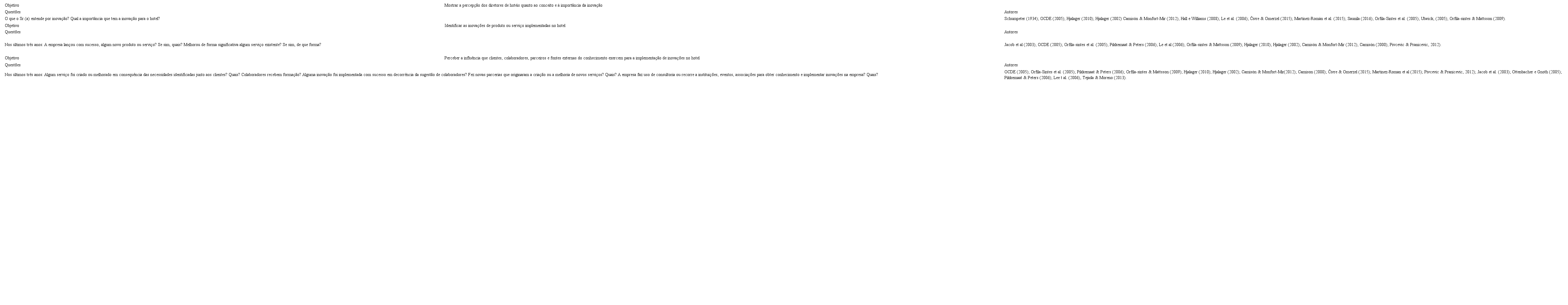 As questões 1 e 2 objetivaram mostrar a percepção dos diretores de hotéis quanto ao conceito e à importância da inovação, ao passo que as questões 3, 4 e 5 objetivaram identificar as inovações de produto ou de serviço implementadas no hotel. As questões de 6 a 10 buscaram saber se clientes, colaboradores, parceiros e outras fontes externas de conhecimento exercem influência para a implementação de inovações no hotel. Há, ainda, o intuito de identificar possíveis categorias de análise da inovação que não estejam contempladas na revisão de literatura.