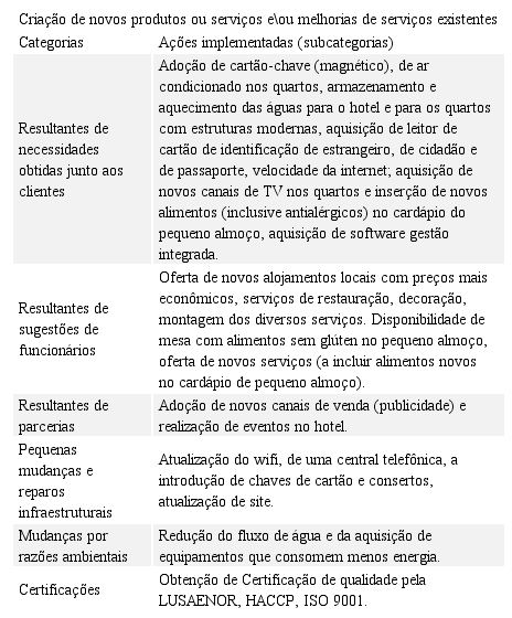 A “Criação de novos produtos ou serviços e\ou melhorias de serviços existentes”, sinteticamente entendida como a implementação de inovações, foi um dos quesitos analisados. E válido dizer que as respostas dos entrevistados foram agrupadas em 6 categorias e subcategorias, que são mostradas na Tabela 2.