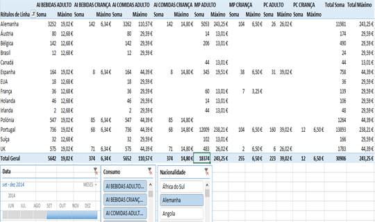 O número total de hóspedes que realizaram consumos nos estabelecimentos da unidade foram de 21692, ou seja, apenas cerca de 67% da amostra analisada. Estima-se que os hóspedes da unidade tenham efetuado gastos, em relação ao alojamento e aos consumos nos estabelecimentos da unidade, num valor médio aproximado de 416 € por estadia.