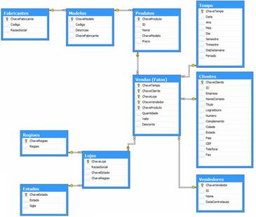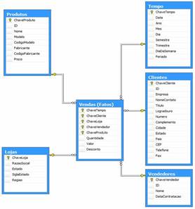 Como é possível observar na Figura 2.1, a tabela Vendas corresponde à tabela de factos. Desta forma, podem estabelecer-se relações com qualquer das várias tabelas de dimensão: Produtos, Clientes, Tempo, Lojas e Vendedores, sendo conveniente salientar a ausência de normalização das tabelas de dimensões, ou seja, a presença de dados redundantes, embora estas possam inclusivamente comportar hierarquias. Por exemplo, na Dimensão Tempo, o componente Dia da Semana poderia estar dividido em segunda, terça, quarta, quinta, sexta, sábado e domingo.